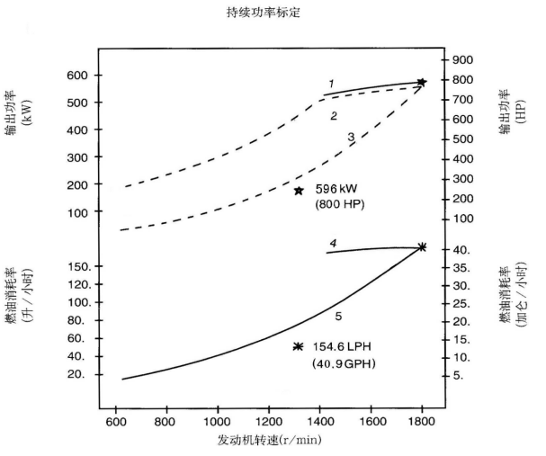 標(biāo)定條件:功率標(biāo)定是基于ISO8665標(biāo)準(zhǔn)規(guī)定的條件:大氣壓力為100kPa (29.612英寸汞柱),環(huán)境溫度為25℃(77°F),相對(duì)濕度為30%。螺旋槳軸功率為按97%扣除齒輪箱損失后的凈功率。燃油消耗是基于使用比重為838.9g/l(7.001磅/加侖),LHV為42780kJ/kW(18390Btu/lb)的35°API燃油。 1. 制動(dòng)功率 kW(HP) 4. 軸功率對(duì)應(yīng)的燃油消耗 2. 扣除齒輪箱損失后的軸功率 kW(HP) 5. 螺旋槳推進(jìn)曲線對(duì)應(yīng)的燃油消耗 3. 螺旋槳推進(jìn)曲線 持續(xù)功率:這種功率標(biāo)定的發(fā)動(dòng)機(jī)允許在全負(fù)荷工況下連續(xù)不斷地使用。這種功率為ISO3046標(biāo)準(zhǔn)功率 * 對(duì)非LTA發(fā)動(dòng)機(jī),其燃油耗高1-3%。 | ||||||