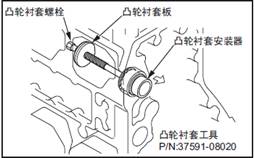 (5) 擰入三菱S6R柴油發動機凸輪軸襯套螺栓,推壓三菱S6R柴油發動機凸輪軸襯套安裝器,將三菱S6R柴油發動機凸輪軸襯套拔出。