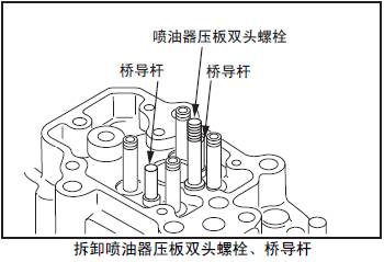 拆卸時參照「三菱S12柴油發動機本體的檢測、修理」的「三菱S12柴油發動機噴油器壓板雙頭螺栓、橋導桿的檢測,更換」項。