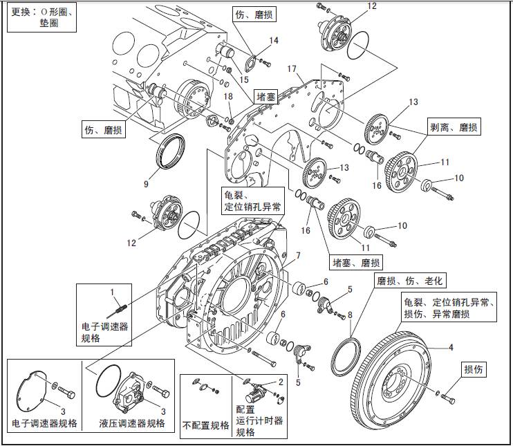 3 三菱S12柴油發動機調速器驅動器(液壓三菱S12柴油發動機調速器規格)( 解體、檢修和組裝參照「三菱S12柴油發動機燃油系統」項)蓋板( 電子三菱S12柴油發動機調速器規格)