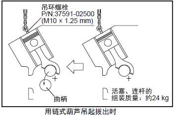 (4) 確認(rèn)三菱S12柴油發(fā)動(dòng)機(jī)連桿大端進(jìn)入了三菱S12柴油發(fā)動(dòng)機(jī)缸套內(nèi),同時(shí)緩緩向上起吊三菱S12柴油發(fā)動(dòng)機(jī)活塞。
