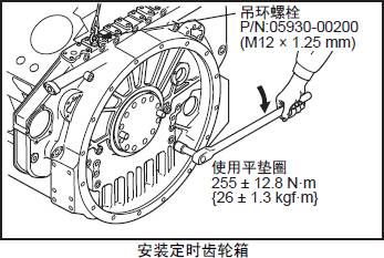 (3) 在三菱S12柴油發動機正時齒輪箱上安裝吊具,對準定位銷后,安裝三菱S12柴油發動機正時齒輪箱。