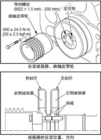 (2) 按照隔板、內(nèi)側(cè)的三菱R16柴油發(fā)動(dòng)機(jī)減振器、隔板、外側(cè)的三菱R16柴油發(fā)動(dòng)機(jī)減振器、三菱R16柴油發(fā)動(dòng)機(jī)曲軸三菱S16柴油機(jī)皮帶輪的順序,通過(guò)導(dǎo)向螺栓,對(duì)準(zhǔn)定位銷進(jìn)行安裝。