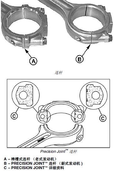PRECISION JOINT™ 連桿和連桿瓦蓋說明如下:制造 PRECISION JOINT™ 連桿時(shí),使用激光束在連桿上加工切槽。然后,通過連桿孔中的精密心軸,從接合處(C) 將連桿瓦蓋和連桿分開。
