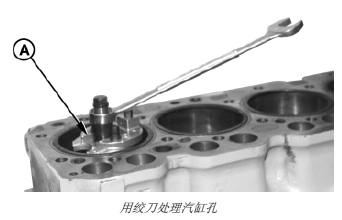 6. 用刮刀或絞刀 (A) 清除汽缸套孔中的積碳。用壓縮空氣去除汽缸體內(nèi)的異物。