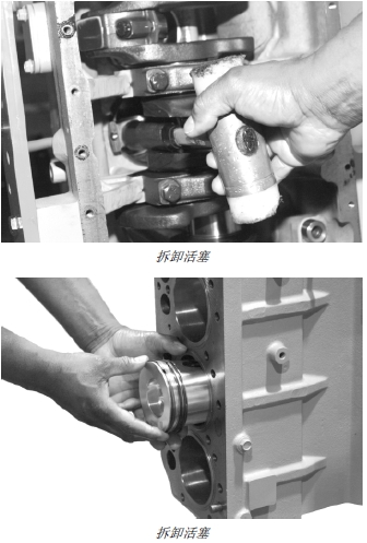 重要提示: 握住活塞,以防活塞掉落。活塞環(huán)脫離汽缸套后,活塞便會(huì)掉落。如果重復(fù)使用汽缸套,拆卸活塞和連桿總成時(shí)一定要格外小心,不要讓連桿撞擊汽缸套孔。