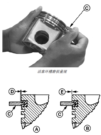 1. 使用合適的活塞環槽磨損量具 (C) 檢查梯形環槽(上槽)的磨損程度。在活塞四周多個測量點檢查環槽。量規肩部不能與活塞環口接觸。量規肩部與活塞環口有間隙 (D) 表明活塞環槽狀態良好。如果活塞環槽磨損,應成套更換活塞和汽缸套。如果活塞環槽完好,應繼續執行下面的步驟。