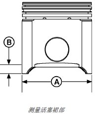 1. 在與活塞銷孔中心線成直角、距活塞底部 (B) 28 毫米(1.1 英寸)處測量活塞裙部外徑 (A)。