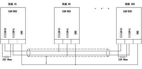 并機系統中的機組之間的起停順序、負載分配、開關閉合時間等各種功能都是通過各并機并網并聯控制器的數據聯機進行通信,然后由控制器進行數據處理并發出相應控制命令,從而實現對各機組的并車控制。通信采用 RS-485網絡,其在并機并網并聯控制器中的聯機示意圖如下: