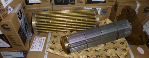 康明斯KTA發(fā)動機采用內置式板翼式,置于發(fā)動機水道腔體內,直列與V形機型的區(qū)別在于:直列機型機油冷卻器芯置于機體側部水道腔體內, V形機型機油冷卻器芯置于V型機體中部水道腔體內。)M11發(fā)動機采用整體管束式冷卻器,置于發(fā)動機排氣管側。