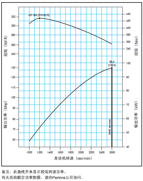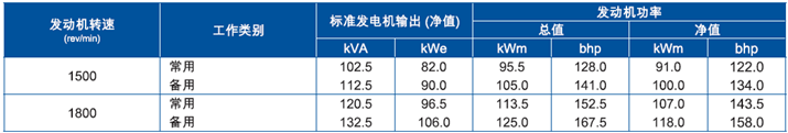 上表所有額定功率數據均為配備標準尺寸風扃與驅動器比率的發動機,ISO/TR 14396/IS0 8528條件下操作時數據。有關上述條件以外操作的數據請咨詢珀金斯公司,Perkins提供的性能公差為±5%。電氣參數假設功率因數為0.8與發動機效率90%。