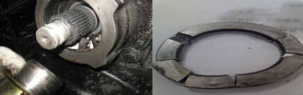 處理方法: 拆法蘭檢查輸出軸總成及相關零部件損壞程度: 一種情況是止推墊塊碎,輸出軸及軸承未損傷,不需拆總成,僅更換油封、止推墊塊、輸出法蘭及鎖緊螺母,在輸出軸上涂密封膠。