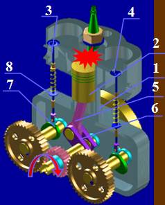 汽缸體1、活塞2、進氣閥3、排氣閥4、連桿5、曲軸6、凸輪7、頂桿8、