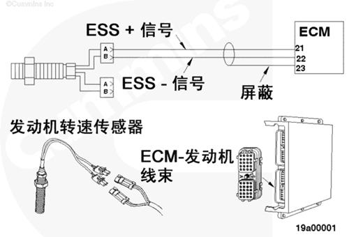 發(fā)動機(jī)線束電子控制模塊 (ECM) 接頭的發(fā)動機(jī)轉(zhuǎn)速傳感器 (ESS) 信號觸針 21 和 22 表明發(fā)動機(jī)轉(zhuǎn)速超過報警(停機(jī))閾值。