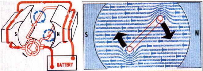 l          把電路環線置于兩磁極中。電流流向:蓄電池正→磁極線圈→ 碳刷→ 換向器→電路環線 → 換向器→碳刷 →蓄電池負