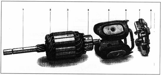 l          1、轉子軸   2、轉子線圈   3、轉子磁芯   4、換向器  5、磁極靴   6、磁場線圈   7、碳刷   8、碳刷架