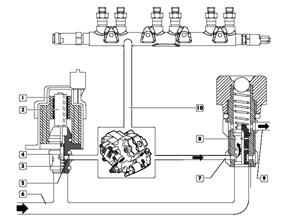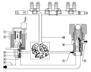 1. 進油計量比例閥控制線圈  2. 閥芯  3. 復位彈簧   4. 柱塞閥  5. 進油計量比例閥燃油出口6. 高壓油泵的進油口(經過濾清器過濾后的燃油)7. 高壓油泵的回油油道  8. 階躍回油閥的柱塞  9. 回油 10. 高壓燃油