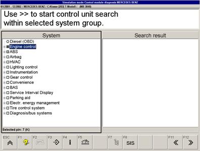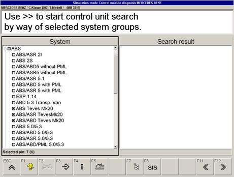 如果名稱前面的框有一灰色背景,在此組列出的系統在自動組搜索不能發現。 (通過點擊加符號或F7可以獲得清單)。如果安裝在車上的控制單元在組搜索時不能被找到,相關的控制單元必須在清單中手動選擇。通過F7, 你可以打開或關閉自動選擇。
