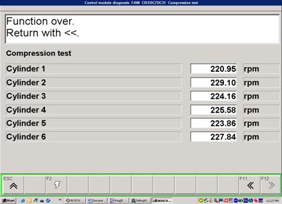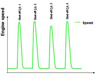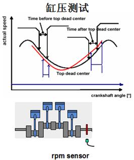 缸壓測試時,ECU停止對發動機的噴油。起動機帶動發動機運轉。電腦同時測量各缸壓縮,膨脹階段的轉速。