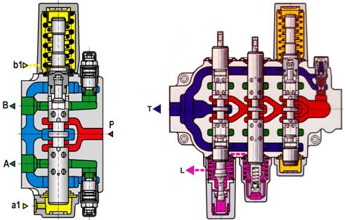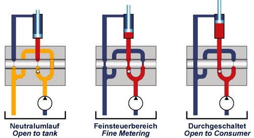 以上所述的工作原理同樣適用于幾個閥桿,根據(jù)液壓泵提供有效流量,所有操作能從停止到最大速度相應(yīng)并行地受到控制。