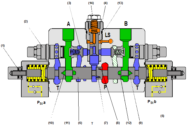 (1) 行程限制塊 (2)二次壓力釋放/防蝕閥 (3) 負載保持閥 (4) LUDV 壓力補償閥 (5) 先導(dǎo)梭閥 (6) 控制閥桿 (7) 輸入測流口 p ® A (8) 輸入測流口p ® B (9) 輸出測流口 B ® T (10) 輸出測流口 A ® T (11) 通道 pc ® A (12) 通道 pc ® B (13) 壓力補償控制閥桿 (14) 壓縮彈簧