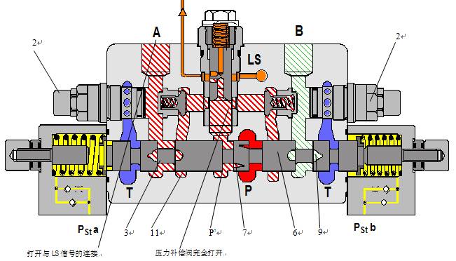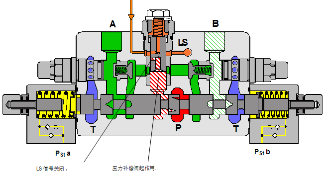 當(dāng)用在LS控制塊情況下時,壓力補償閥不是安置在泵和主閥桿之間,而是安置在主閥桿和執(zhí)行端口之間。