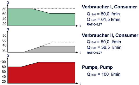 在LUDV系統(tǒng)中,所有執(zhí)行機構(gòu)部分的Dp測流節(jié)流口總相同。但不是一個恒定值。根據(jù)非飽和狀態(tài)的程度,它可能在設(shè)定值DpLS控制器 和大約2 bar的壓力之間變化(見表:Dp依賴需求的流量),在這個范圍內(nèi),LUDV系統(tǒng)按比例相應(yīng)地分配流量。