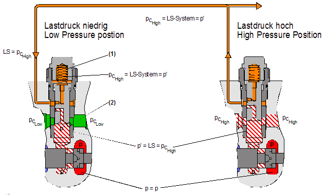 在單獨動作情況下或當(dāng)執(zhí)行機構(gòu)的負載壓力Pc在系統(tǒng)中處于最高,通過來自P‘通道的壓力補償閥的內(nèi)孔產(chǎn)生負載傳感(LS)壓力,并且反饋到泵控制器和帶有較低負載壓力的壓力補償閥部件。