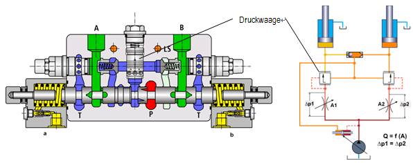 所有相關(guān)的壓力補償閥都互相連接而且用相同的壓力差操縱,其中最高的負載壓力適用于所有壓力補償器。