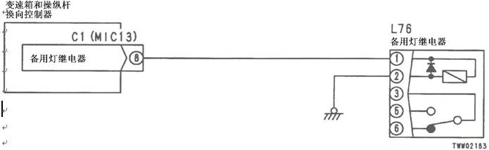 1)備用燈繼電器故障 2)變速箱和操縱桿控制器C1(雌)(8)L76(1)之間線束與電源短路,與機(jī)箱接地短路,觸點(diǎn)有故障或斷開(kāi) 3)后燈繼電器L76(雌)(2)和機(jī)箱接地之間線束觸點(diǎn)有故障或斷開(kāi) 4)變速箱和操縱桿控制器有故障 | ||||