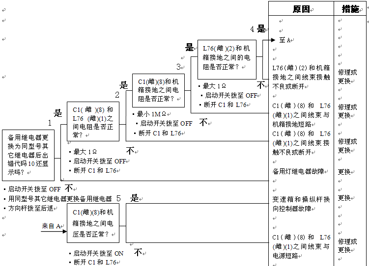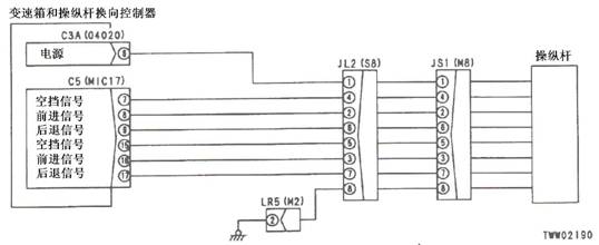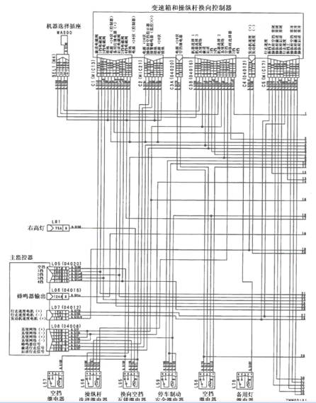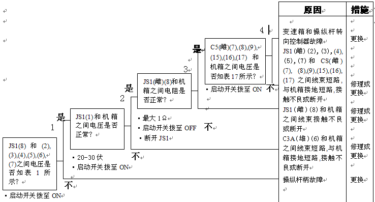 1)方向桿故障 2)組合開(kāi)關(guān)電源故障 以下線束與電源短路,與機(jī)箱接地短路,觸點(diǎn)有故障或斷開(kāi): 3)變速箱和操縱桿控制器C3B(雌)(7)和L04(5)之間線束 4)變速箱和操縱桿控制器C3B(雌)(15)和L04(6)之間線束 5)變速箱和操縱桿控制器C3B(雌)(8)和L04(7)之間線束 6)變速箱和操縱桿控制器C3B(雌)(16)和L04(8)之間線束 7)變速箱和操縱桿控制器故障 |