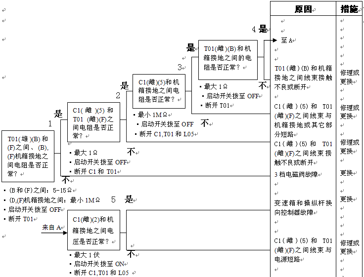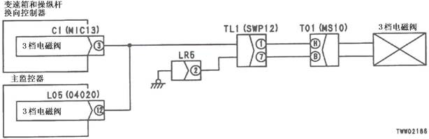 1)3檔電池閥故障 2)變速箱和操縱桿控制器C1(雌)(5)-TL1(3)-T01(F)之間線束與電源短路,與機(jī)箱接地短路,觸點(diǎn)有故障或斷開(kāi) 3)機(jī)箱-TL1(7)-T01(B)之間線束與機(jī)箱接地短路,觸點(diǎn)有故障或斷開(kāi) 4)變速箱和操縱桿控制器有故障 | ||||