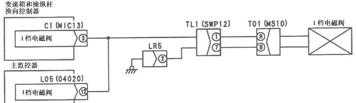 1)1檔電池閥故障 2)變速箱和操縱桿控制器C1(雌)(3)-TL1(1)-T01(H)之間線束與電源短路,與機(jī)箱接地短路,觸點(diǎn)有故障或斷開(kāi) 3)機(jī)箱-TL1(7)-T01(B)之間線束與機(jī)箱接地短路,觸點(diǎn)有故障或斷開(kāi) 4)變速箱和操縱桿控制器有故障 | ||||