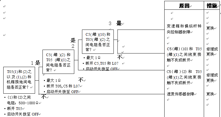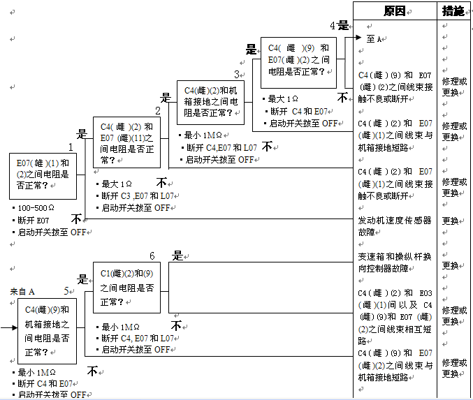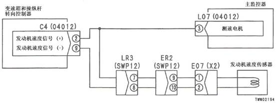 1)速度傳感器故障 2)速度傳感器安裝調(diào)整故障 3)變速箱和操縱桿控制器C4(雌)(2)-LR3(7)-ER2(9)-E07(1)之間線束觸點(diǎn)有故障或斷開(kāi) 4)變速箱和操縱桿控制器C4(雌)(9)-LR3(8)-ER2(10)-E07(2)之間線束觸點(diǎn)有故障或斷開(kāi) 5)變速箱和操縱桿控制器有故障 |