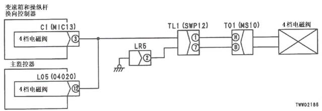 1)4檔電池閥故障 2)變速箱和操縱桿控制器C1(雌)-TL1(4)-T01(E)之間線束與電源短路,與機(jī)箱接地短路,觸點(diǎn)有故障或斷開(kāi) 3)機(jī)箱-TL1(7)-T01(B)之間線束與機(jī)箱接地短路,觸點(diǎn)有故障或斷開(kāi) 4)變速箱和操縱桿控制器有故障 | ||||
