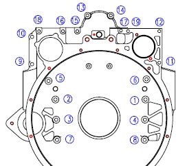 � 在將飛輪殼孔與導(dǎo)向銷配合,并將固定螺栓擰緊2∼3 個螺紋后,按照擰緊順序(鋸齒方式)擰緊固定螺栓至規(guī)定扭矩。