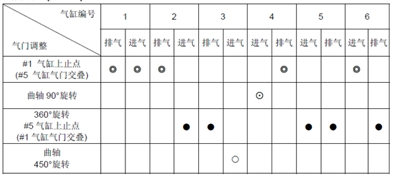 5) 當#5 氣缸處于上止點時,按照下面列表中“●”調整氣門間隙。