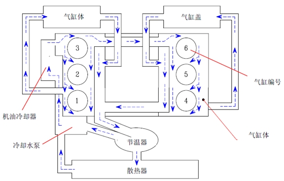 � 查看冷卻系統的內部,水泵環繞著機油冷卻器循環將水抽起來,通過水管吸收油料的熱量,然后流過氣缸體的水套和氣缸蓋的水道,吸收燃燒室的熱量。