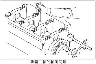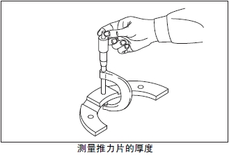 測量推力片的厚度。超過極限值時(shí)更換新的推力片。根據(jù)曲軸的磨損程度,在曲軸重新研磨使用時(shí),使用加大尺寸的推力片。曲軸的研磨要領(lǐng)參考「發(fā)動(dòng)機(jī)本體的檢測、修理」的「最后端曲軸頸的軸頸寬度研磨」項(xiàng)。