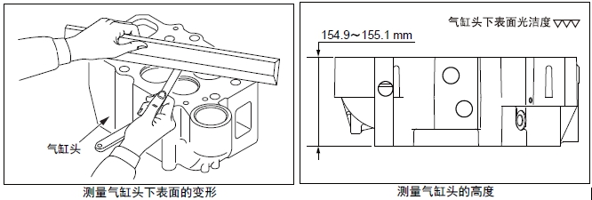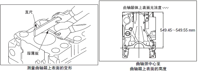 在曲軸箱的上表面放置直尺,用厚薄規(guī)測量變形量。超過極限值時(shí),更換新品或研磨修整。進(jìn)行研磨修整時(shí),要記錄最大研磨量。另外,氣缸頭下面進(jìn)行研磨修整時(shí),合計(jì)的最大研磨量限定在0.50 mm以內(nèi)。
