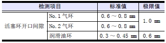 將活塞環(huán)放用標(biāo)準(zhǔn)量器或放在新的缸套內(nèi),測量開口間隙。超過極限值時(shí),更換整套活塞環(huán)。