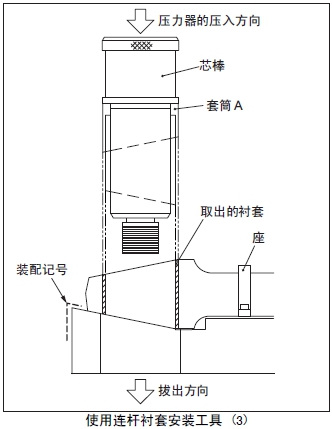 (2) 套筒A裝入心軸,套筒A的裝配記號(紅色刻線)對準(zhǔn)座臺(tái)的裝配記號(紅色刻線)后安裝在連桿襯套內(nèi)。