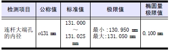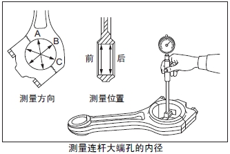 測量大端孔內(nèi)徑時(shí),分別按照圖示A、B、C 方向,測量前后2 處。將A、B、C 的最大值減去最小值為橢圓量。超過極限值時(shí)更換新品。