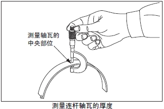 測量連桿軸瓦的中央部位的厚度。超過極限值時(shí),將軸瓦上下整套更換。根據(jù)曲柄銷的磨損程度,在曲軸重新研磨使用時(shí),使用減小尺寸的軸瓦。曲軸的研磨要領(lǐng)參考「發(fā)動(dòng)機(jī)本體的檢測、修理」的「曲軸的曲柄銷和曲軸頸的研磨」項(xiàng)。