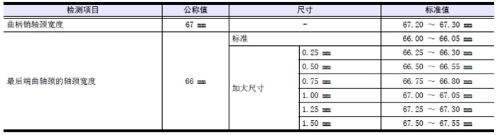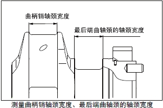 (2) 測量曲柄銷和最后端曲軸頸的軸頸寬度。根據(jù)最后端曲軸頸的軸頸寬度的磨損程度使用加大尺寸推力片時(shí),按照加大尺寸推力片的規(guī)格研磨曲軸。