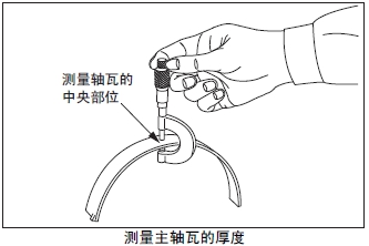 測量主軸瓦的中央部位的厚度。超過極限值時(shí),將主軸瓦上下整套更換。根據(jù)曲軸頸的磨損程度,在曲軸重新研磨使用時(shí),使用減小尺寸的主軸瓦。曲軸的研磨要領(lǐng)參考「發(fā)動(dòng)機(jī)本體的檢測、修理」的「曲軸的曲柄銷和曲軸頸的研磨」項(xiàng)。