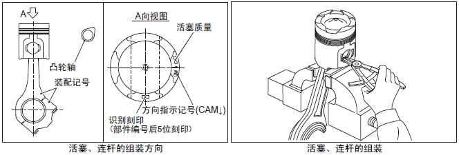 (1) 活塞銷涂抹潤滑油后插入,將活塞和連桿組裝在一起。活塞和連桿的組裝方向如圖所示。