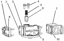 將密封墊 (10) 和接頭 (7) 安置在發動機機油濾清器底座 (3) 上,安裝螺栓 (9) 。