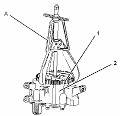卸下將驅動齒輪 (1) 固定在發動機機油泵 (2) 泵軸上的螺栓。 使用工具 (A) ,從軸上卸下驅動齒輪。 從軸上卸下鍵。