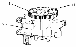 將驅動齒輪 (1) 安裝在發動機機油泵 (2) 泵軸上。 安裝螺栓 (14) 。 擰緊螺栓至扭矩為 55 ± 10 N·m (41 ± 7 lb ft)。